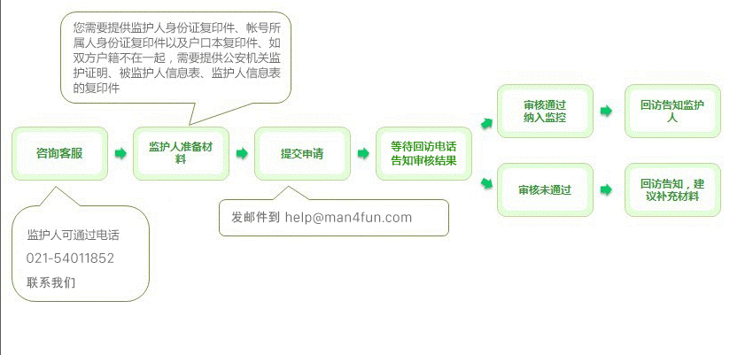 2.电子邮件服务 监护人可以通过电子邮件提交相关信息,邮箱地址:help@man4fun.com